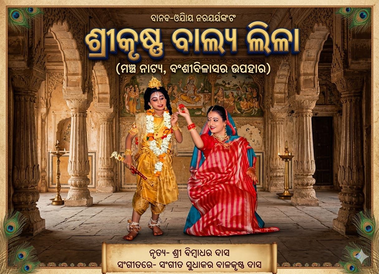 Sri Krishna Balyalila is a charming Odissi production by Bansi Bilash, presented in 1987 , celebrating the enchanting childhood pastimes of Sri Krishna. With expressive dance direction by Sri Bimbadhar Das and a melodious score by Sangeet Sudhakar Balkrishna Dash, the production vividly brings to life the playful, mischievous, and divine balya leelas, capturing the innocence and joy of Krishna’s early years through the grace and beauty of the Odissi tradition.