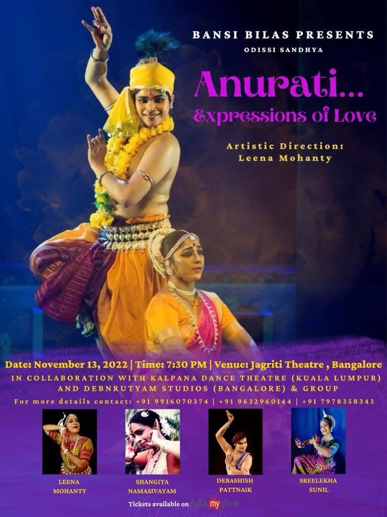 Anurati – Expressions of Love (2022) Produced by Bansi Bilash with concept and artistic direction by Smt. Leena Mohanty, this performance delves into the shades of love and longing, brought to life by the graceful expressions of dancers Shangita Namasivayam and Guru Shri Debashish Pattnaik.